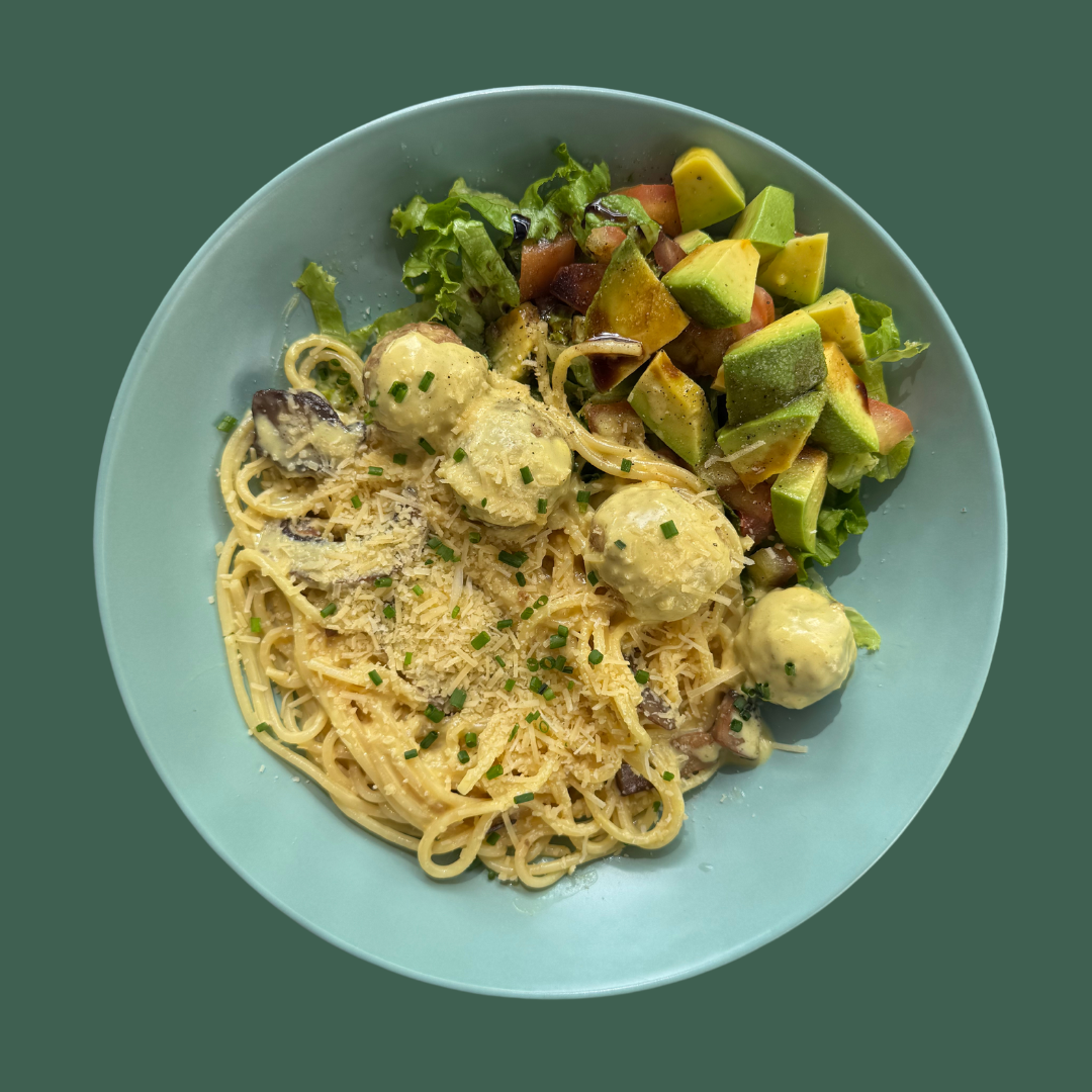 Pasta + Stroganoff, Albóndigas de res, Champiñones, ensalada de la casa, reducción balsámica & parmesano