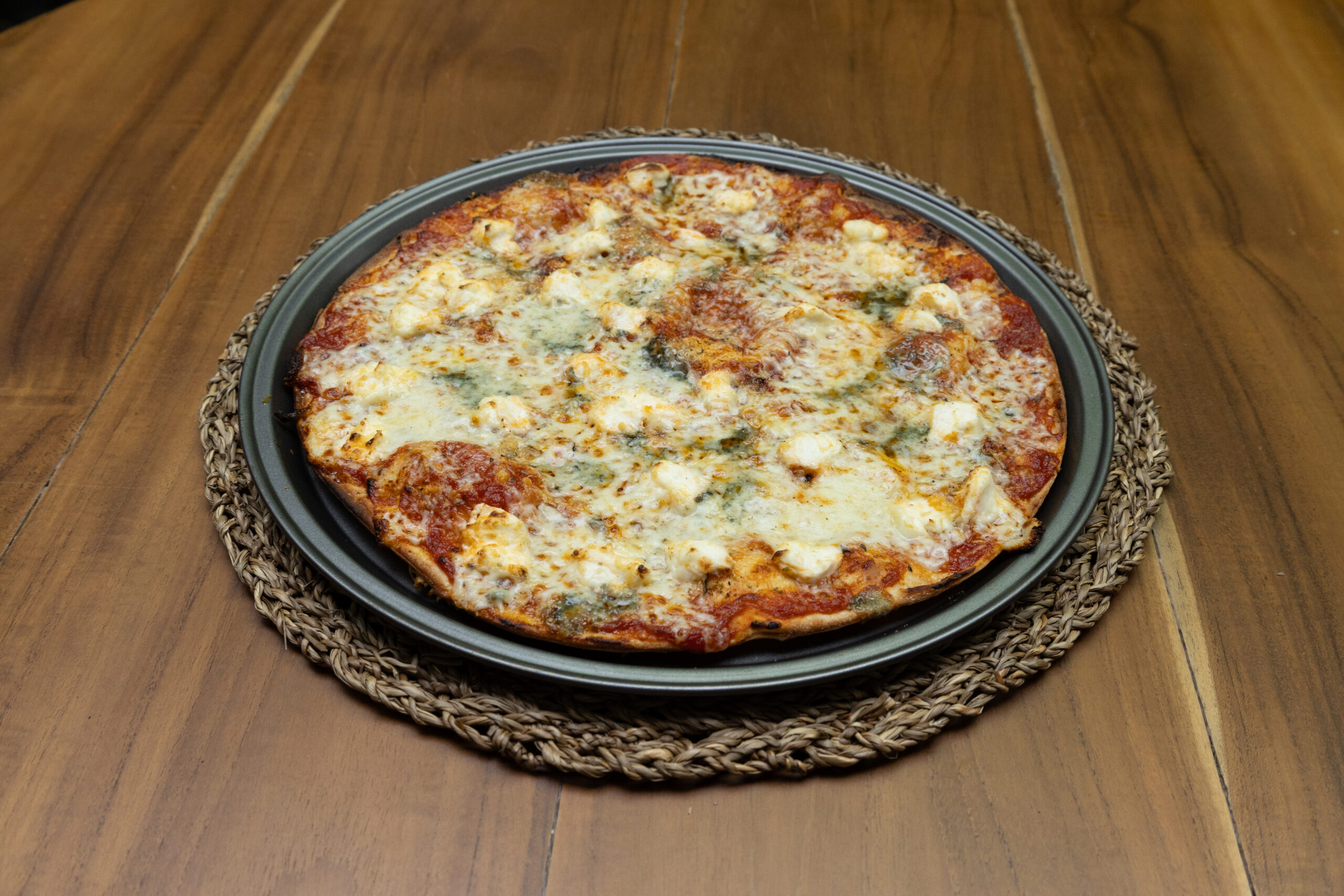 Masa madre delgada, crocante & sin bordes + base napolitana + mozarella + queso crema Philadelphia + parmesano + queso azul danés.