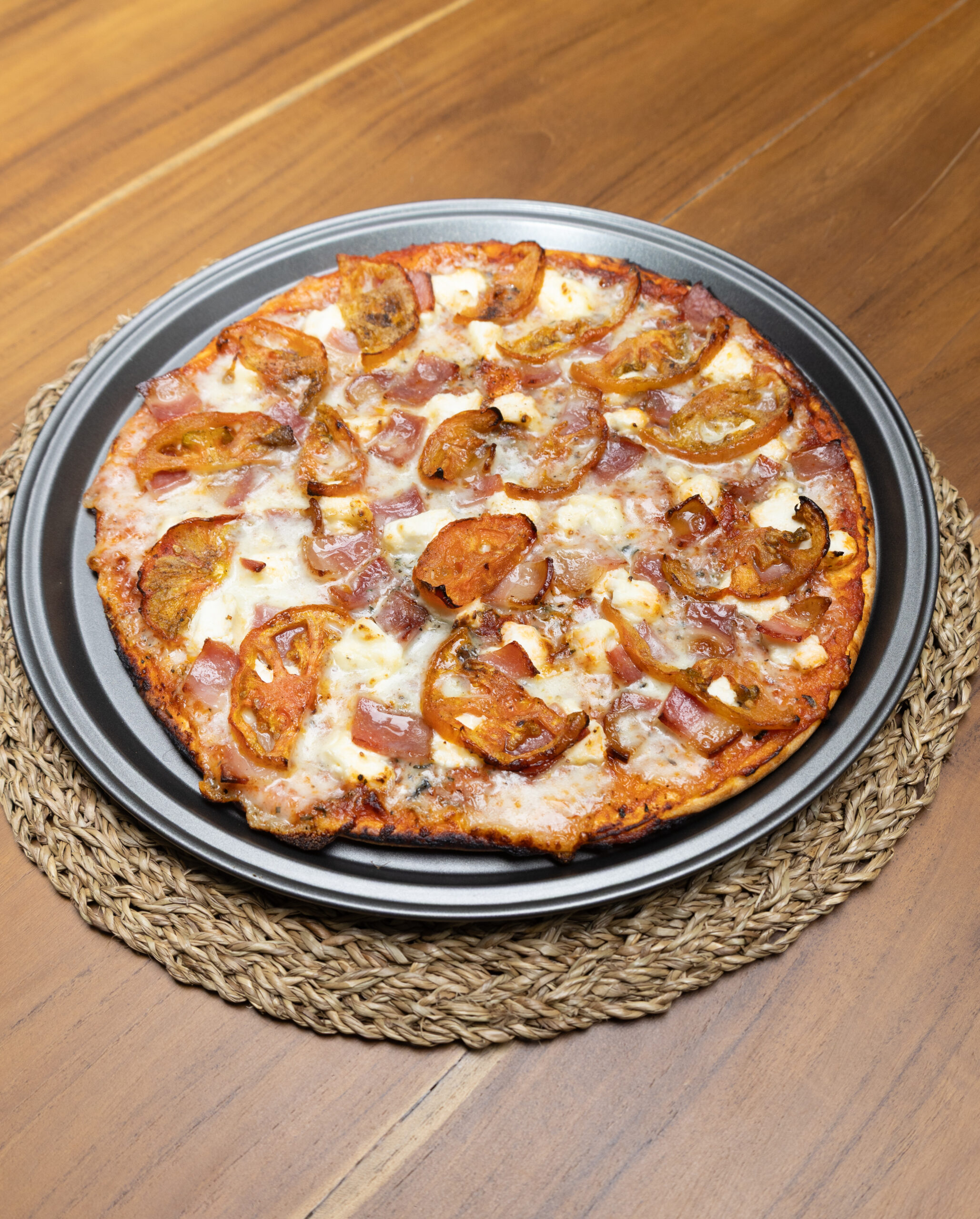 Masa madre delgada, crocante & sin bordes + base napolitana + mozarella + queso crema Philadelphia + tocineta ahumada + tomates asados.
